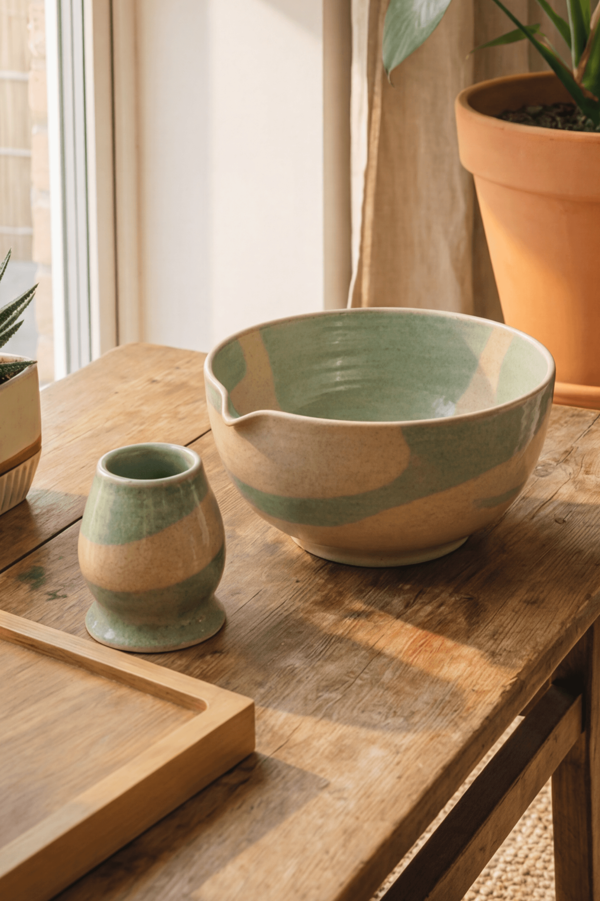 Batedor de bambu importado, essencial para criar a espuma perfeita do matcha.
